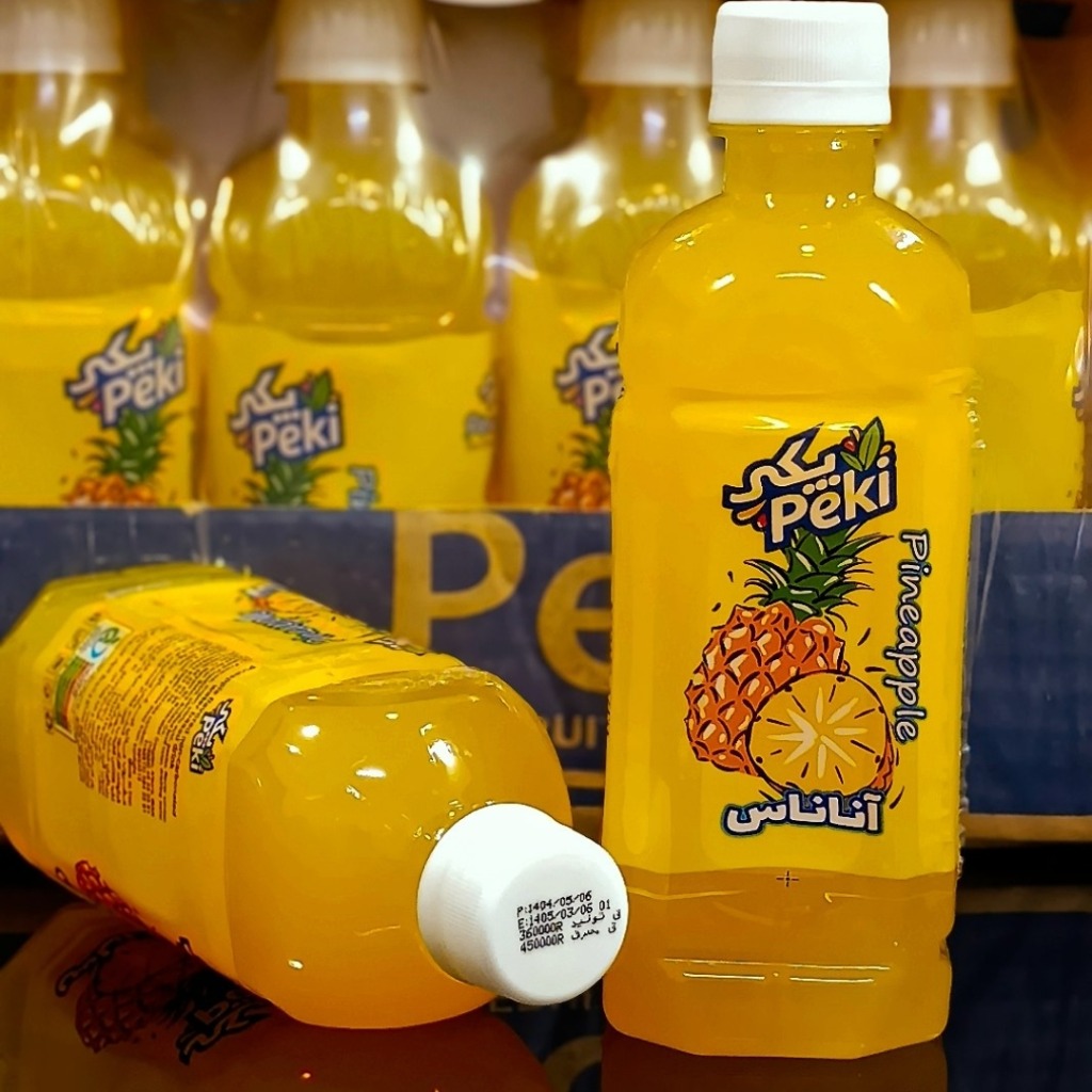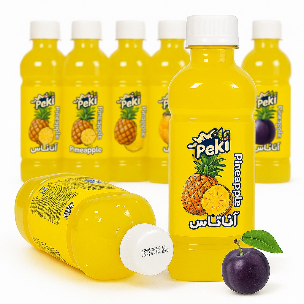 - طراحی بطری: شفاف با درب سفید، لیبل جذاب با تصویر آناناس و نوشتههای فارسی و انگلیسی