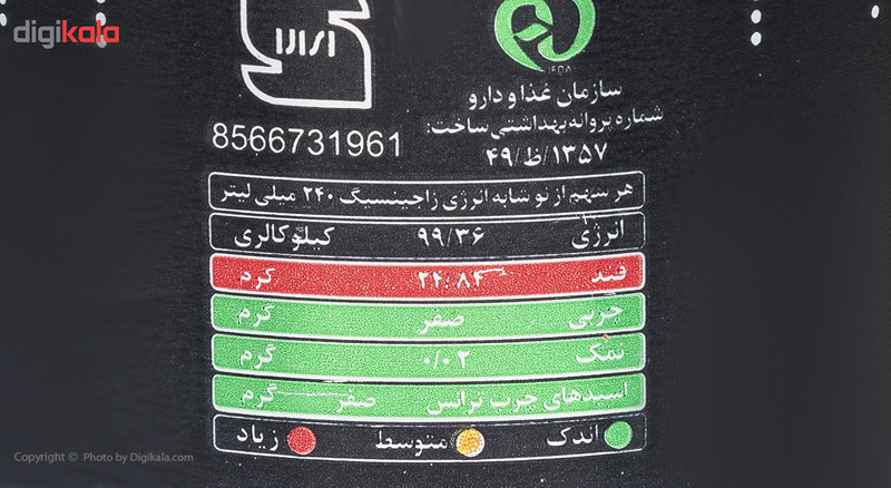 ارزش غذایی محصول در هر 240 میلیلیتر: - انرژی: 99.36 کیلوکالری - قند: 24.84 گرم - نمک: 0.02 گرم - فاقد چربی و اسیدهای چرب ترانس نامناسب برای کودکان، زنان باردار و شیر ده، بیماران قلبی و افراد حساس به کافئین