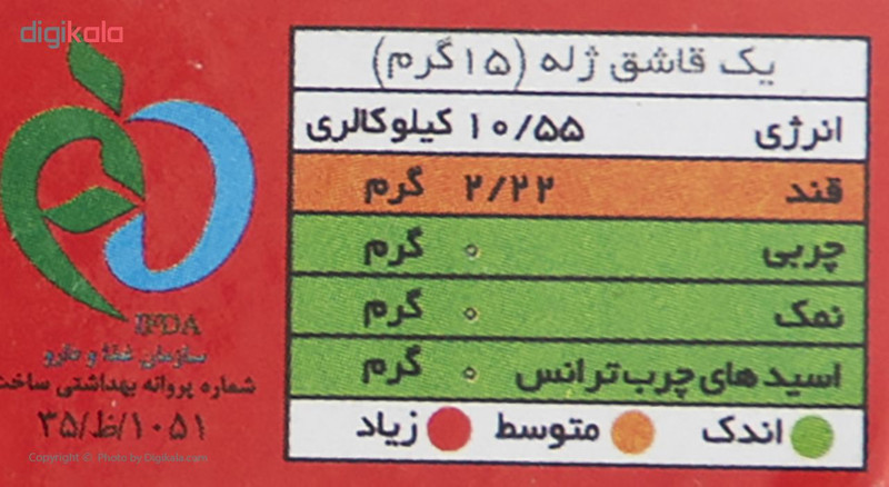 ارزش غذایی در هر سهم از مصرف (15 گرم): انرژی: 10.55 کیلوکالری قند: 2.2 گرم چربی: 0 گرم نمک: 0 گرم اسیدهای چرب ترانس: 0 گرم